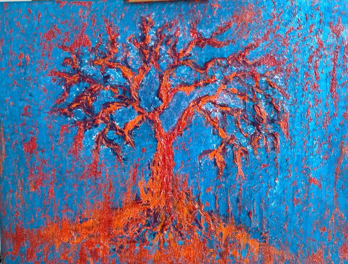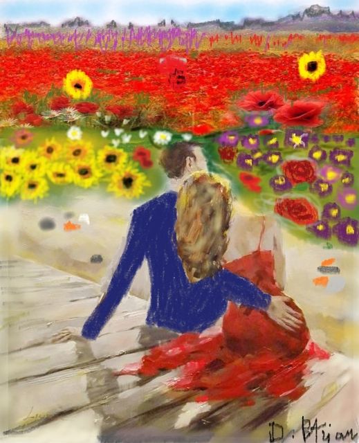 Un uomo e una donna si siedono ai bordi di un campo, di solo erba si guardano negli occhi in silenzio, Lui ,con il braccio circonda la vita di Lei, lei appoggia il capo sulla spalla di lui, i loro cuori sono emozionati, si riconoscono dai battiti, il prato si riempie di fiori, senza logica, nell’aria un profumo d’immenso. Daniela Patrian Dipinto: acquarelli,pastelli