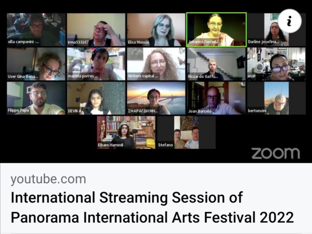 Irene Doura-Kavadia : Congratulazioni a tutti! È stata una sessione magnifica, davvero! Ringraziamo tutti gli stimati delegati per essere stati una parte importante dell’evento con le loro magnifiche opere d’arte! Menzione speciale al Chief Advisor di Writers Capital Foundation Joan Josep Barcelo, cuore e anima della sessione, e agli stimati curatori Elisa Mascia (membro del Comitato Organizzatore di Panorama) e Filippo Papa (Panorama Chief Youth Coordinator) per tutto il loro bellissimo lavoro durante questa sessione. Complimenti a Silla Maria Campanini, Coordinatrice Globale di PANORAMA e a tutto il team che ha reso il Panormama Arts Festival un evento così grandioso! L’evento dal vivo è stato onorato con la presenza degli onorevoli membri della WCIF Johanna Devadayavou (Consigliere del manager del panorama), Smaragdi Mitropoulou e Marco Antonio Rodriguez Sequeiros (membri esecutivi) e del segretario esecutivo Devika Warrier. Promettiamo di unirci di nuovo nel regno dell’arte molto presto! Infatti, nell’INAUGURAZIONE del PANORAMA Art Festival 22 ad Atene, in Grecia. Lì, insieme alla mostra fisica a tema di Guerra e Pace, avremo il piacere di annunciare i prestigiosi PANORAMA ART Awards. Rimani sintonizzato! Il meglio deve ancora venire! Un caro abbraccio a tutti!