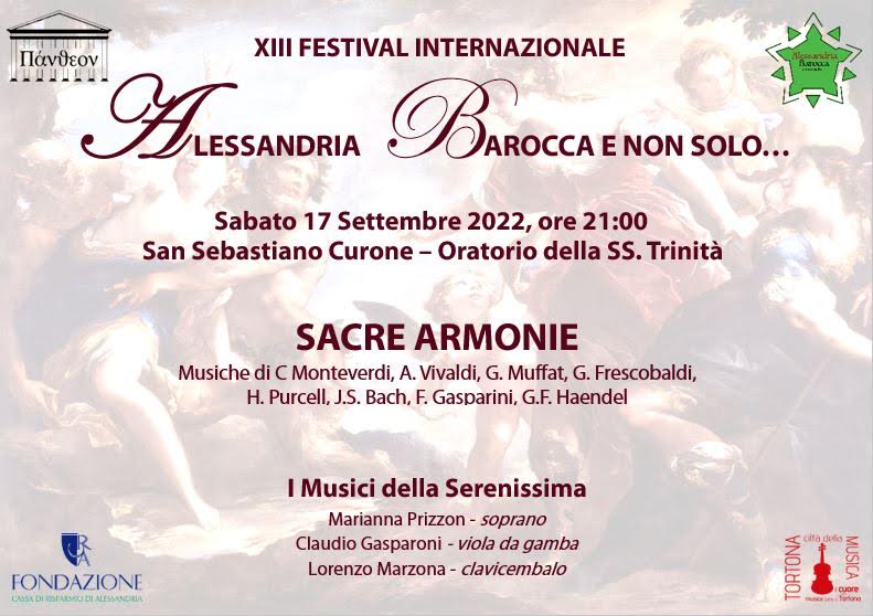 “SACRE ARMONIE” è il titolo del concerto realizzato in collaborazione con Perosi60, che I MUSICI DELLA SERENISSIMA (Marianna Prizzon – soprano, Claudio Gasparoni – viola da gamba e Lorenzo Marzona – clavicembalo) terranno Sabato 17 settembre, alle ore 21, a San Sebastiano Curone, presso il settecentesco Oratorio della SS. Trinità