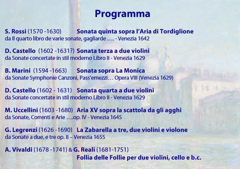 Venerdì 23 settembre alle ore 21 il Festival si sposterà ad Acqui Terme, nella bella Sala Santa Maria, in via Barone 3, per il concerto dell’ensemble I MUSICALI AFFETTI (Fabio Missaggia, Matteo Zanatto – violini, Carlo Zanardi – violoncello, Fabio Merlante – tiorba, arciliuto e chitarra barocca, Nicola Lamon – clavicembalo) dal titolo “SEICENTO ITALIANO – affetti e bizzarrie nel segno della Serenissima” . In programma musiche di Rossi, Castello, Marini, Uccellini, Legrenzi, Vivaldi.