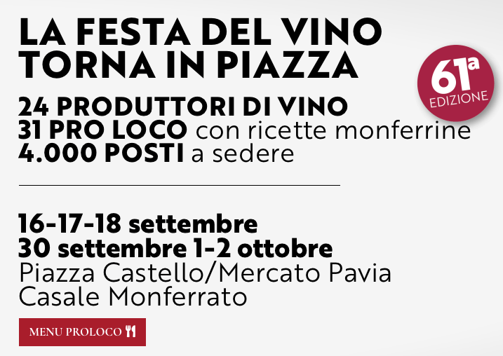 Info, costi e prenotazione (obbligatoria entro il 16 settembre): info@vinimonferratocasalese.it o Whatsapp 340 9443635.