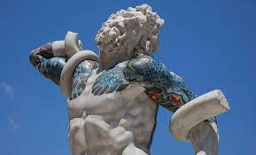 Un’arte che colpisce stupisce perché la riproduzione di opere della classicità come la Venere di Milo ,il Lacoonte, o di Canova, come Amore e Psiche,vengono reinventate dai tatuaggi che le rivestono in parte e il colore nero ne altera la visione di alcune porzioni. Non basta : si tratta spesso di tatuaggi della mafia russa e,dunque, se il tatuaggio è già di per sé un atto di rottura,di dissacrazione della tradizione ,farlo con simboli della mafia russa diventa un atto di piena dissacrazione. Viale alterna figure tipiche della tradizione tra cui anche busti e parti del corpo come mani che indicano, a pugni (segno del comando) a oggetti comuni come pneumatici, sacchi di carta, guantoni da pugile, barchette di carta o..pali come quelli fatti per la biennale che rende con una verosomiglianza al materiale d’origine che sorprende davvero e che ci spinge ..a toccare gli oggetti per sincerarci del materiale di cui sono fatti.