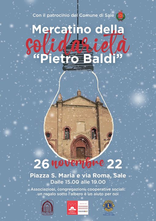 Sabato 26 novembre si svolgerà la terza edizione del Mercatino della Solidarietà che da quest’anno abbiamo voluto intitolare a Pietro Baldi, recentemente scomparso. Fondatore e storico Presidente della Aic, Pietro Baldi si è sempre impegnato nel sociale, nello studio e promozione del borgo di Sale.