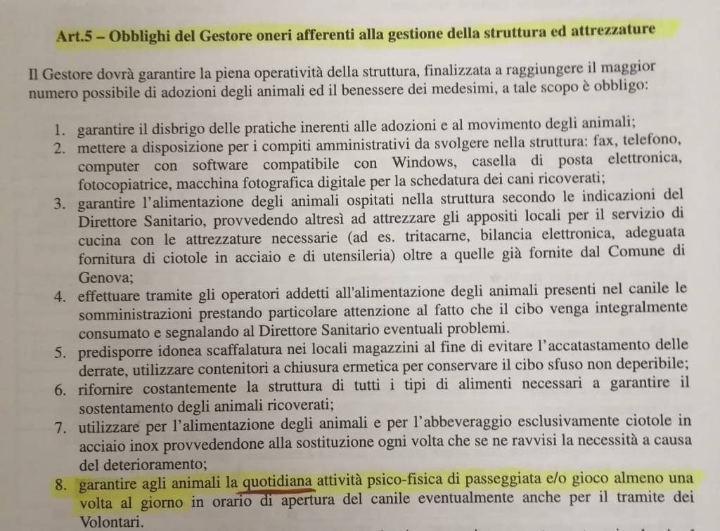 come e’ evidenziato nel capitolato al punto 8 i cani devono almeno avere un uscita garantita al giorno per il loro benessere psicofisico cosi non e’ almeno negli ultimi giorni sopratutto per quanto riguarda i cani morsicatori e’ successo un incidente non provocato dai cani a quanto e’ sorto , e’ chi hanno punito? i cani embe , non lo trovo giusto che paghino loro per colpa altrui addirittura a quanto so perche sono volontario del qua citato canile alcuni cani non escono da settimane , essendo cani poco equilibrati esiste il rischio che peggiorino quindi faccio l’ appello al buon senso che questi cani tornino ad uscire ovviamente in sicurezza, chiudo con una frase di Gandhi:” un paese civile si misura in base come trattano gli animali”.
