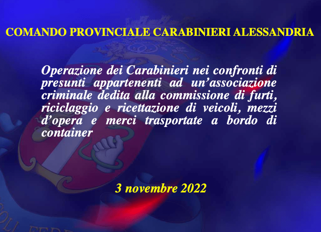 Operazione dei Carabinieri contro presunti appartenenti ad un’associazione criminale dedita alla commissione di furti, riciclaggio, ricettazione di veicoli, mezzi d’opera e merci varie trasportate a nord di un container in transito o destinate al polo logistico tortonese.