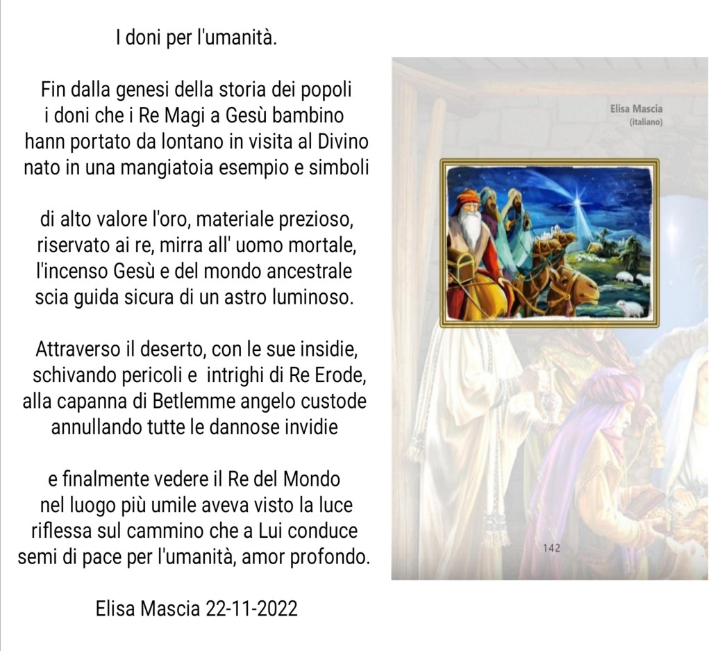 Natale vuol dire nascita, non solo del bambino Gesù, ma dovrebbe anche essere la nostra nascita, per trasformarci in persone migliori, sensibile, empatiche. Amare è la parola magica, amare è la parola che risolve, amare è Natale. Questi ultimi anni sono stati duri per tutti, ed hanno tirato fuori la parte peggiore dell’umanità. Cosa siamo? siamo buoni e cattivi, nessuno è perfetto, la perfezione non la possediamo, però possiamo avere qualcosa a disposizione di tutti, l’amore, la nascita spirituale, non solo ricordiamo Gesù, ma ricordiamo che tutti noi possiamo fare, possiamo volere, con amore, con il cuore, ed è tutto completamente gratuito. BUON NATALE A TUTTI
