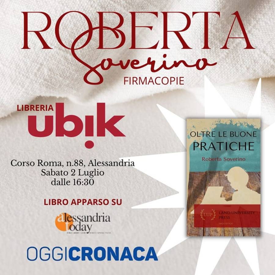 Sabato 2 luglio, a partire dalle ore 16.30, l’autrice Roberta Soverino, docente di scuola dell’infanzia e psicoterapeuta, sarà presente alla libreria Ubik di Corso Roma 88, Alessandria, per incontrare il pubblico e firmare le copie del suo ultimo saggio sul mondo della scuola “Oltre le buone pratiche”, edito da Land University Press. Ingresso libero.