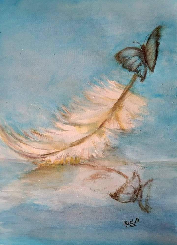 La piuma si posò lenta sullo specchio d’acqua, aveva in sé la leggerezza di un pensiero gentile. La farfalla ebbe appena la forza, nel suo ultimo volo, di adagiarsi sul tremulo appiglio. Sincronicità in bilico nella fugacità di un istante.